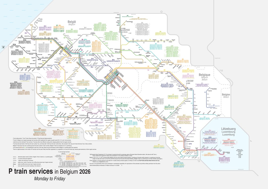 Die angezeigten Informationen basieren auf den aktuellen Daten des NMBS-SNCB-Fahrplans (die manchmal nicht mit denen in den gedruckten Fahrplänen übereinstimmen). Ich kann die Karten recht schnell ändern, wenn Sie mir einen Tippfehler/Fehler mitteilen, den Sie sehen. Ich aktualisiere diese Karten mehrmals im Jahr.