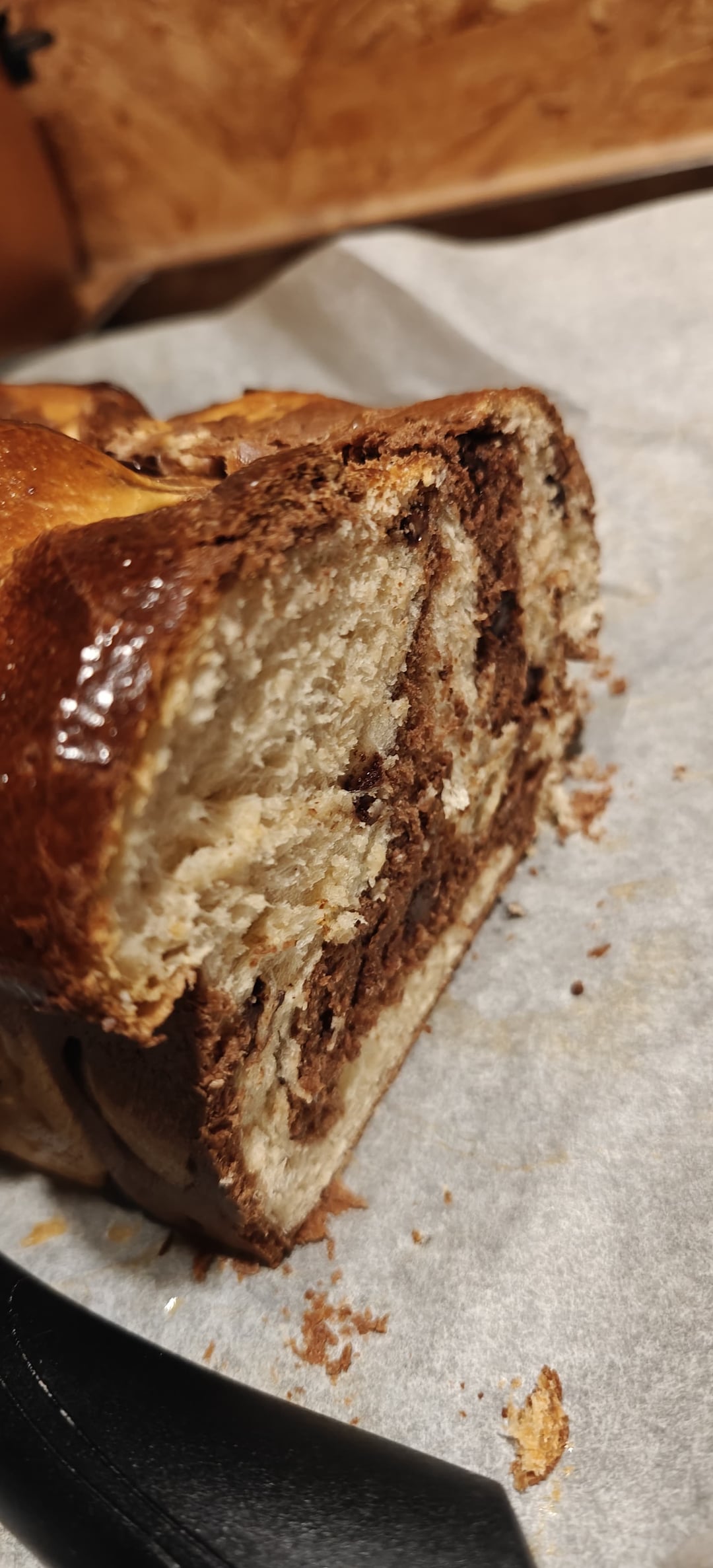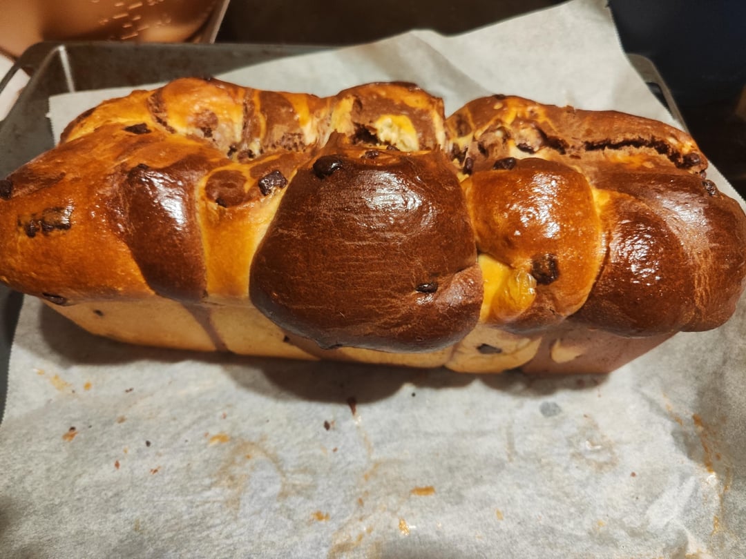 Das Rezept ist von Autumn Kitchen das Sauerteig Brioche Rezept, nur das ich zur Hälfte vom Teig ein paar TL Kakao hinzugefügt habe. 🙂