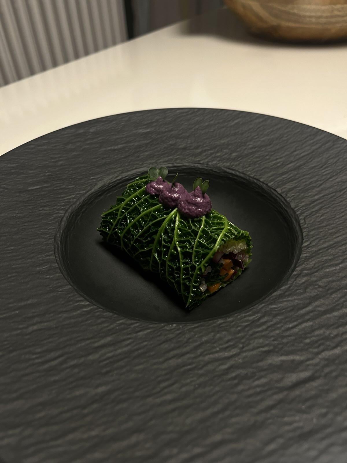 Wirsing Blatt blanchieren. Quinoa und Salat verteilen und Sauere Karotten mittig drauflegen. Seiten einschlagen, Rollen und Seiten ca. 1cm abschneiden. Rotkohl-Haselnuss-Creme positionieren
