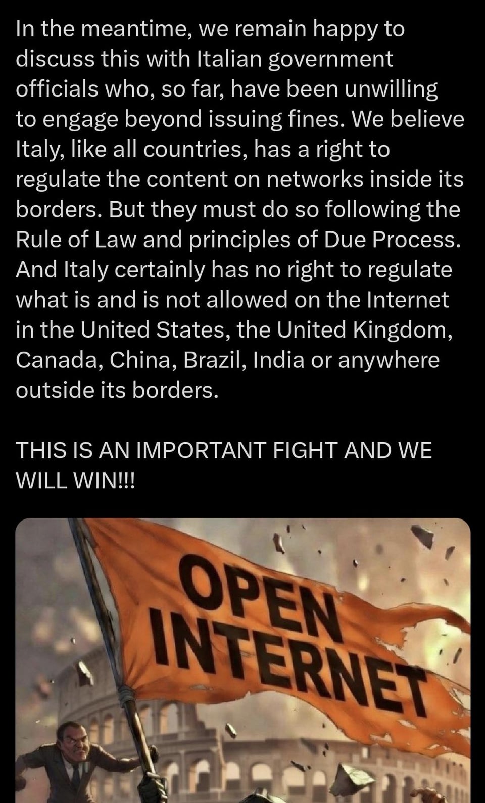 In un altro post ha detto anche che i ricavi in Italia sono di 8 milioni di dollari, mentre l’AGCOM basa la multa sul 2% dei ricavi globali, cosa veramente scandalosa a mio parere..