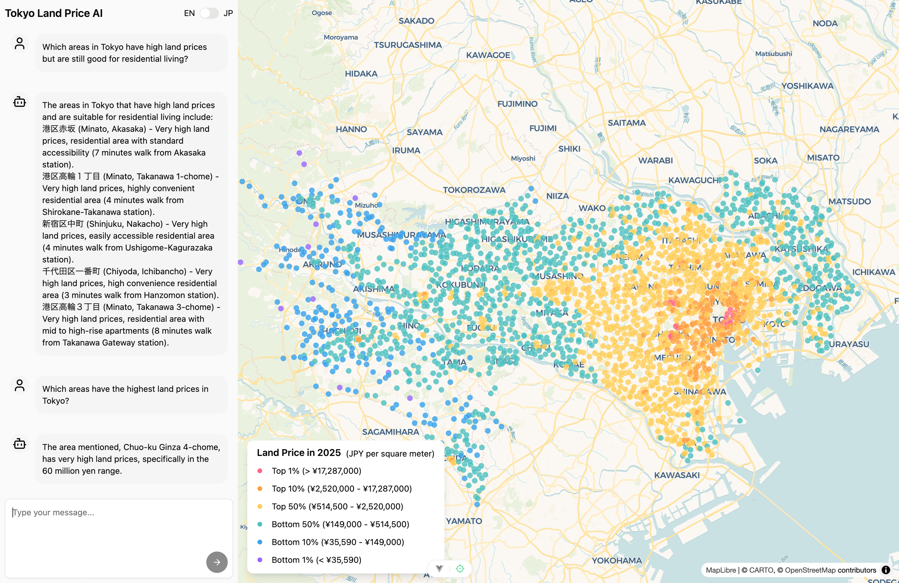 Ich habe eine kleine RAG-Anwendung erstellt, mit der Sie Fragen zu den Grundstückspreisen in Tokio stellen und diese auf einer interaktiven Karte erkunden können. Ich habe dies hauptsächlich erstellt, weil ich versuchen wollte, etwas mit einer interaktiven Karte und realen Daten zu erstellen, und ich fand die Arbeit mit den Preisdaten für offenes Land in Japan interessant.