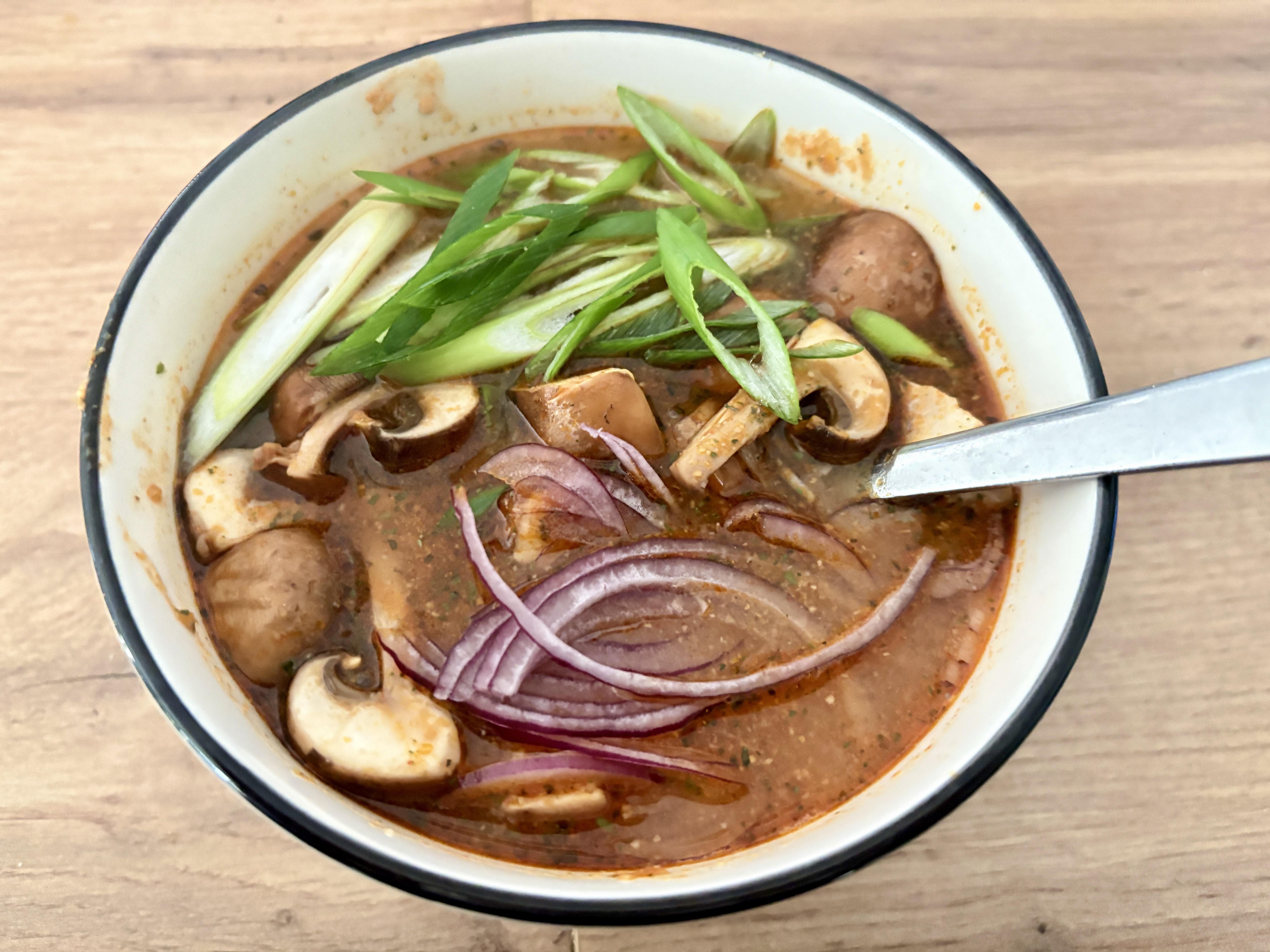 Dafür einfach rotes Miso, Gemüsebrühe und geröstetes Sesamöl mit ein wenig Wasser verrühren, klein geschnittene Pilze und Tofu kurz durch die Pfanne ziehen (oder Airfryer), in die Schale und mit nicht mehr ganz kochendem Wasser aufgießen.