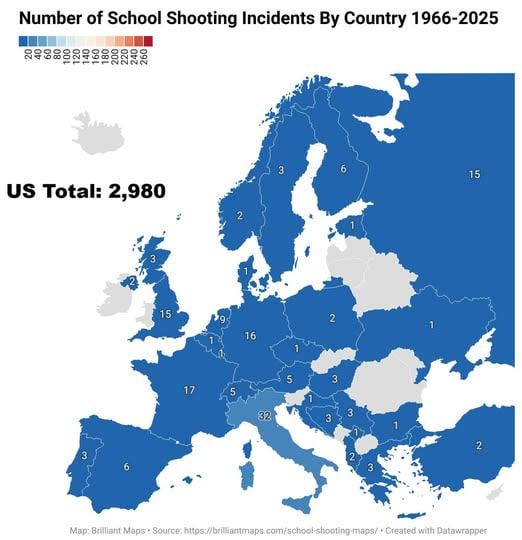 The data used is very broad on its definition of a school shooting. Of the three incidents in England since 2000, one was an accidental discharge at a university clay pigeon club and one was an incident that happened in a private home that happened to be on school grounds. Tragic and unfortunate, but quite far from what comes to mind when most of us think of a „school shooting incident.“