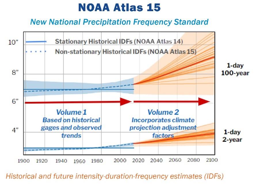 Für jede gegebene Dauer und Wiederkehrperiode spiegelt die Streuung die Unsicherheit wider – sowohl hinsichtlich der möglichen Entwicklung der Treibhausgasemissionen als auch hinsichtlich der Klimamodelle selbst. Der entscheidende Wandel besteht darin, dass Ingenieuren nicht mehr ein Designwert, sondern eine Reihe plausibler Ergebnisse im Laufe der Zeit vorgegeben wird, wodurch die Unsicherheit deutlich wird und nicht verborgen bleibt.
