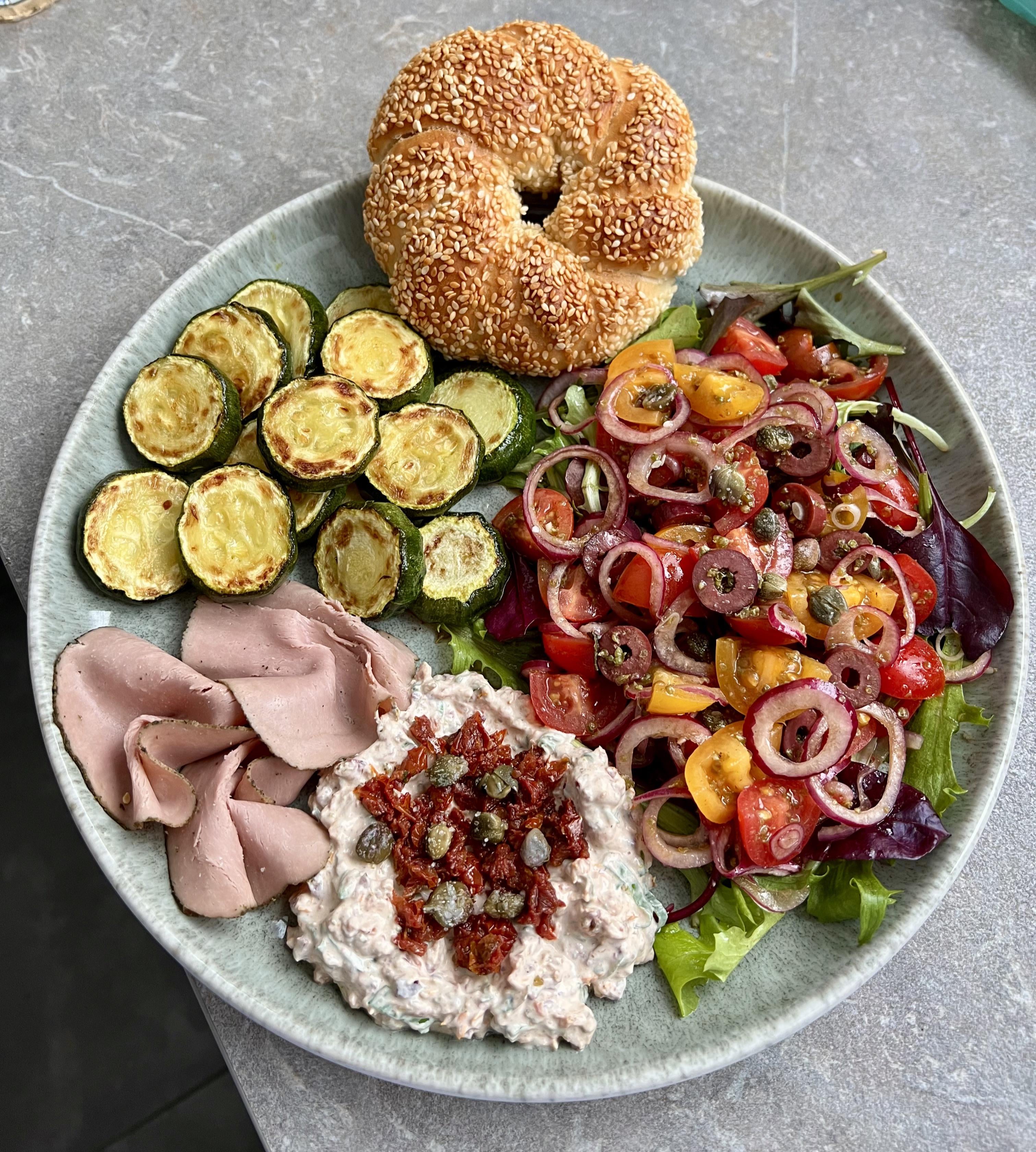 Selbstgemachter Sesamring, Zucchini, Lekka Kräuterschinken, Frischkäse mit getrockneten Tomaten, Oliven, Rucola, Pinienkernen, Oregano und Kapern und Salat mit bunten Tomaten, Zwiebeln, Oliven, Kapern und Balsamicodressing.