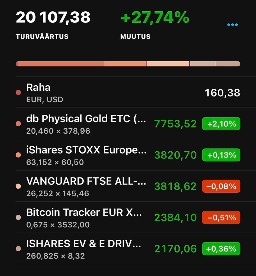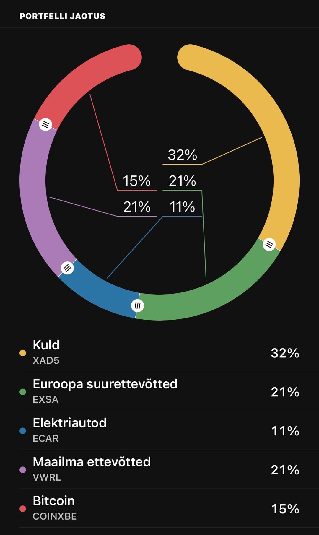 Mina olen üha enam müünud indekseid jälgivaid ETF’e ja pannud raha üksikaktsiatesse. Indeksite puhul häirib mind aastatega kasvanud kontsentreeritus, s.o valitud aktsiad on saavutanud väga suure kaalu indeksist. Kui mina neid aktsiaid omada ei taha, siis ei ole loogiline ka indeksis olla. Selle asemel olen võtnud positsioone kaitsetööstuses (enamasti müüdud ja mitmed koguni 100%+ kasumlikkusega), Euroopa keemia-materjali tööstuses (pikaajalisem positsioon, mis hetkel liigub horisontaalselt või on natuke vee all) ja maavarade-kaevandajate aktsiates (hiljuti teinud suure tõusu – natukene müünud ja natukene pikemaks hoidmiseks).