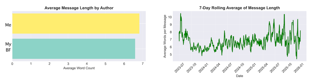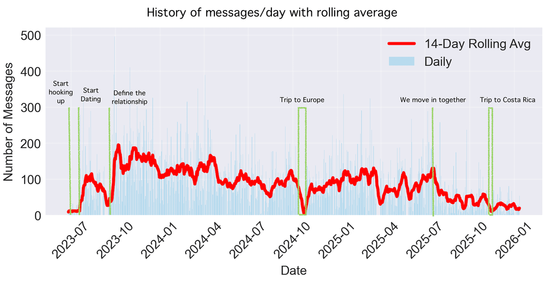 This is very interesting. I really love seeing how the number of messages ebbs and flows with each stage of the relationship. Like I think most people could pick out the stages with out the notations