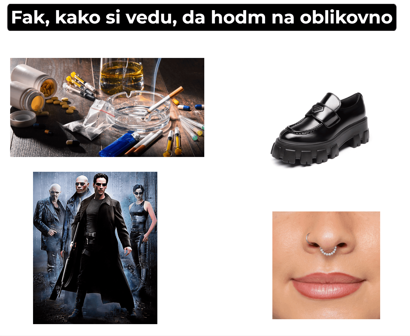 Sej ne bom reku da ne velja, ampak droge so na vseh srednjih, od SUAŠA, teksasa do škofijske in bežgrada. Ostalo kar velja. Je pa srednja oblikovna. Faks pa ni fakulteta ampak akademija… bi pa rekel, da maš na aluo dost bolj raznolik profil ljudi.
