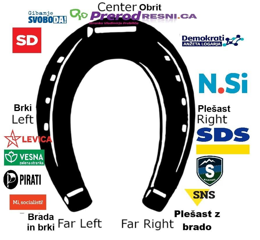 Ganz links (oder alternativ links, um die Piraten nicht zu beleidigen) gibt es einen charakteristischen Schnurrbart und Bart. Du musst also ziemlich behaart sein. Miha K. ist schon so extrem, dass er nach der Hufeisentheorie eine kleine Glatze bekommt. Piraten sind in manchen Dingen sehr alternativ, in anderen etwas weniger, also können sie sich etwas zurückhalten. Dann haben wir links einen Schnurrbart und einen Spitzbart – Levica (Luka M.), Vesna (Uroš M.), also etwas mäßigere Gesichtsbehaarung. Dann haben wir eine rasierte linke Mitte und Mitte. Han, Golob, Prebelič, Šarec und Karl E. sind auch da (aber das Logo wird nicht bezahlt und es ist nicht relevant genug, um Zeit zu verschwenden). Alle haben Haare und sind sorgfältig rasiert. Die Wahrheit ist, dass sie ein falsches Zentrum sind, aber es scheint, dass ihre extremen linken und rechten Meinungen sich gegenseitig aufheben, und Zoran S. hat dann ein eher zentristisches Erscheinungsbild.