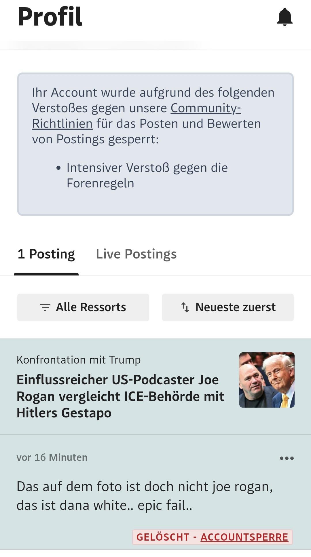 Same here … Ich habe auf ein selten dummes Kommentar geantwortet: „Sinnerfassendes Lesen zählt nicht zu Ihren Stärken“ und wurde nach 13 Jahren gesperrt
