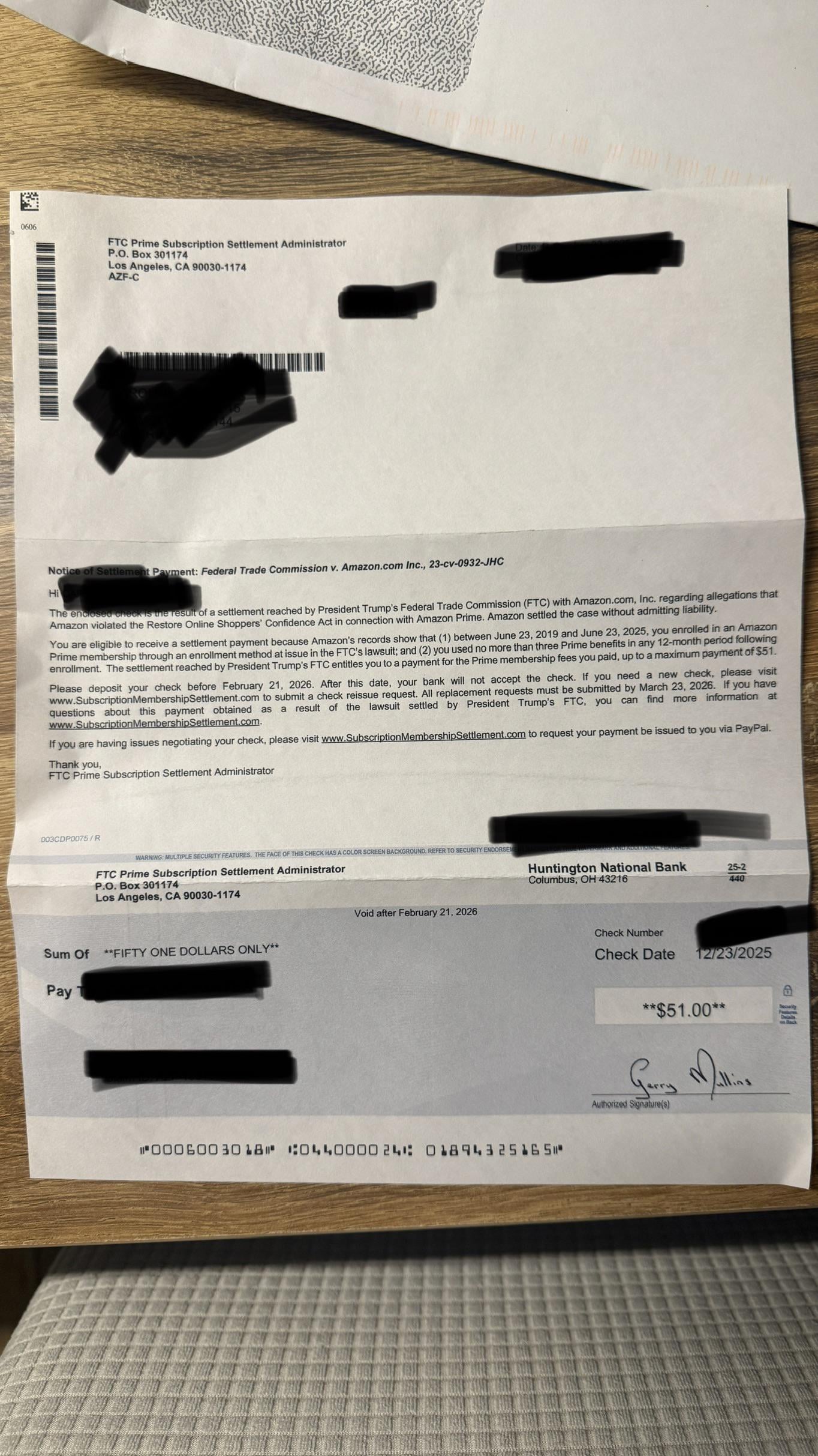 Falls Du einen US-Amazon-Account hast: Die URL schaut prinzipiell legitim aus (siehe [https://www.ftc.gov/enforcement/refunds/amazon-refunds](https://www.ftc.gov/enforcement/refunds/amazon-refunds)) und sie versenden offenbar auch teilweise automatisch Schecks. Es sollte möglich sein, das Geld auch via PayPal zu bekommen stattdessen.