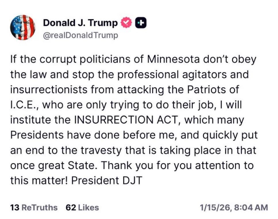It’s like with Venezuela. Provoking them in the hopes that they’ll react but, then when they don’t, going ahead with it anyway. They’ve been waiting for an Ice Officer to get injured or killed so that can do this but now it’s just „protests“ are enough to usher in Marshall Law