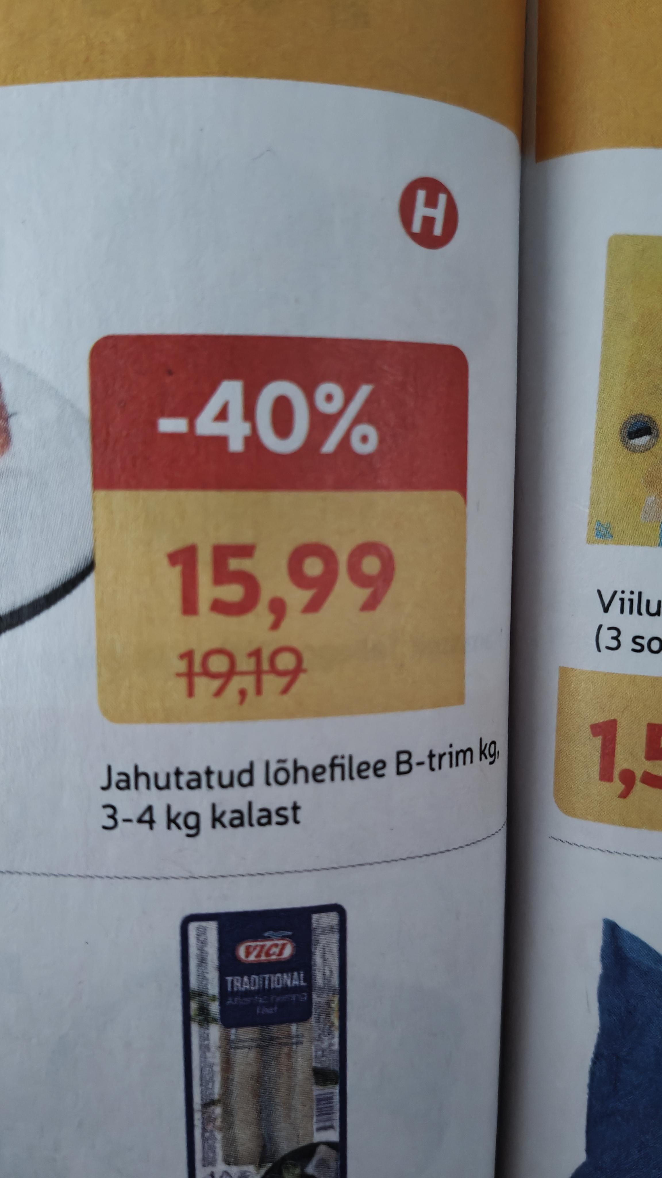 trikk 🙂 see tükk pildil (mitte poes) on 40% 3-4kg kalast ja allahindluse pead ise arvutama ~16.7%