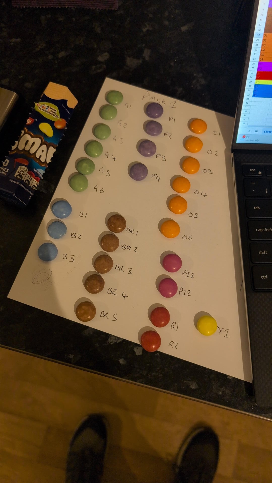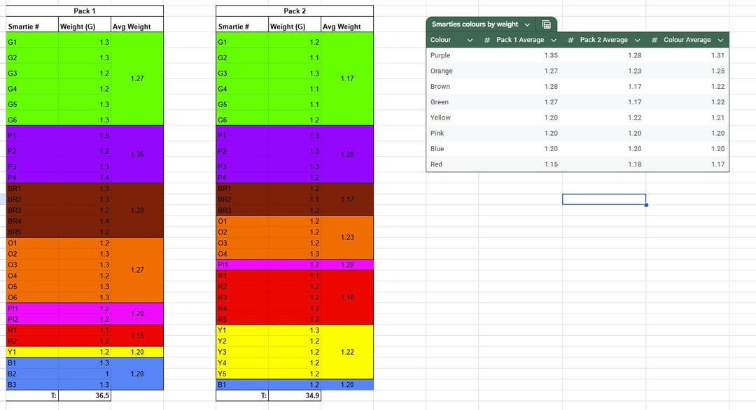 Bei einer Stichprobengröße von 2 Packungen Smarties (ein mit Zucker überzogenes Schokoladenknopf-Ding in Großbritannien) ist statistisch gesehen Lila das schwerste Smartie.