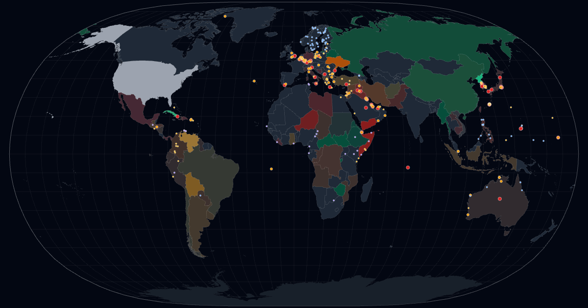 Blättern Sie durch 125 Jahre Staatsstreiche, Invasionen, Stellvertreterkriege, Marionettenregime und Embargos auf einer Karte mit historisch korrekten, sich verschiebenden Grenzen. Sie können Regionen mit drei Voreinstellungen oder einem freien Schwenk- und Zoommodus vergrößern, Interventionstypen oder Militärstützpunkte ein-/ausschalten, wenn Sie möchten, und mit der Maus über Dinge fahren, um Beschreibungen anzuzeigen. Klicken Sie, um Tooltips anzuheften.
