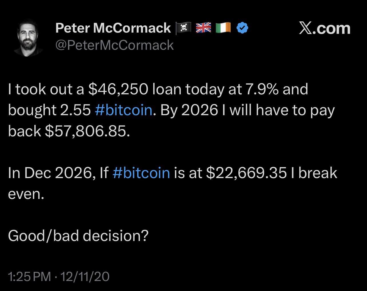 Im Dezember 2020 nimmt ein Typ unser Darlehen in Höhe von 46.000 $ auf, um 2,55 Bitcoin zu kaufen. Ich würde sagen, dass es für ihn geklappt hat
