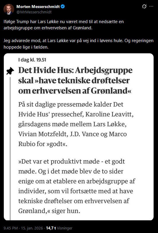 Morten Messerschmidt: „Laut Trump hat Lars Løkke nun mitgeholfen, eine Arbeitsgruppe zum Erwerb Grönlands aufzubauen. Ich habe gewarnt, dass Lars Løkke auf dem Weg in die Höhle des Löwen sei. Und die Regierung ist genau in die Falle getappt.“