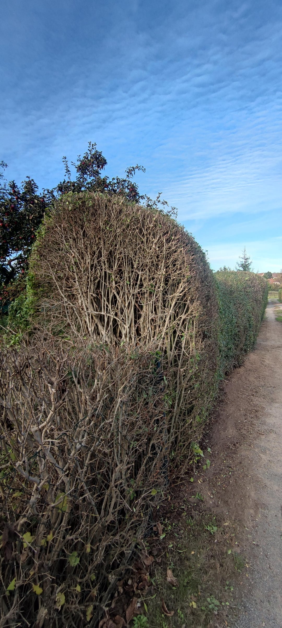 Unsere Hecke vom Grundstück zum weg bereitet uns jedoch Kopfschmerzen. Wie ist sehr breit und verholz. Wir würden sie ungern herausnehmen, da wir dann einen zaun setzten müssten und unser Blickschutz dann fehlen würde. Jedoch muss etwas getan werden, da sie bereits stark in den Weg ragt.