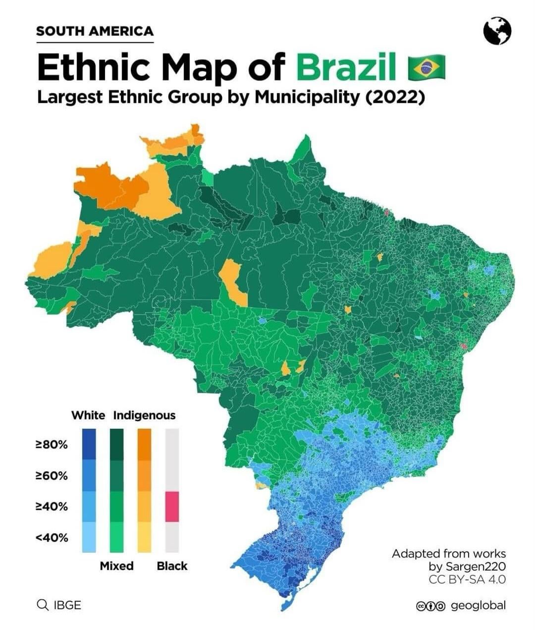 Brazil has one of the largest Black populations outside Africa (around half of the country identifies as Black or mixed), but because the population is extremely mixed, Black Brazilians rarely form an absolute majority in most municipalities.