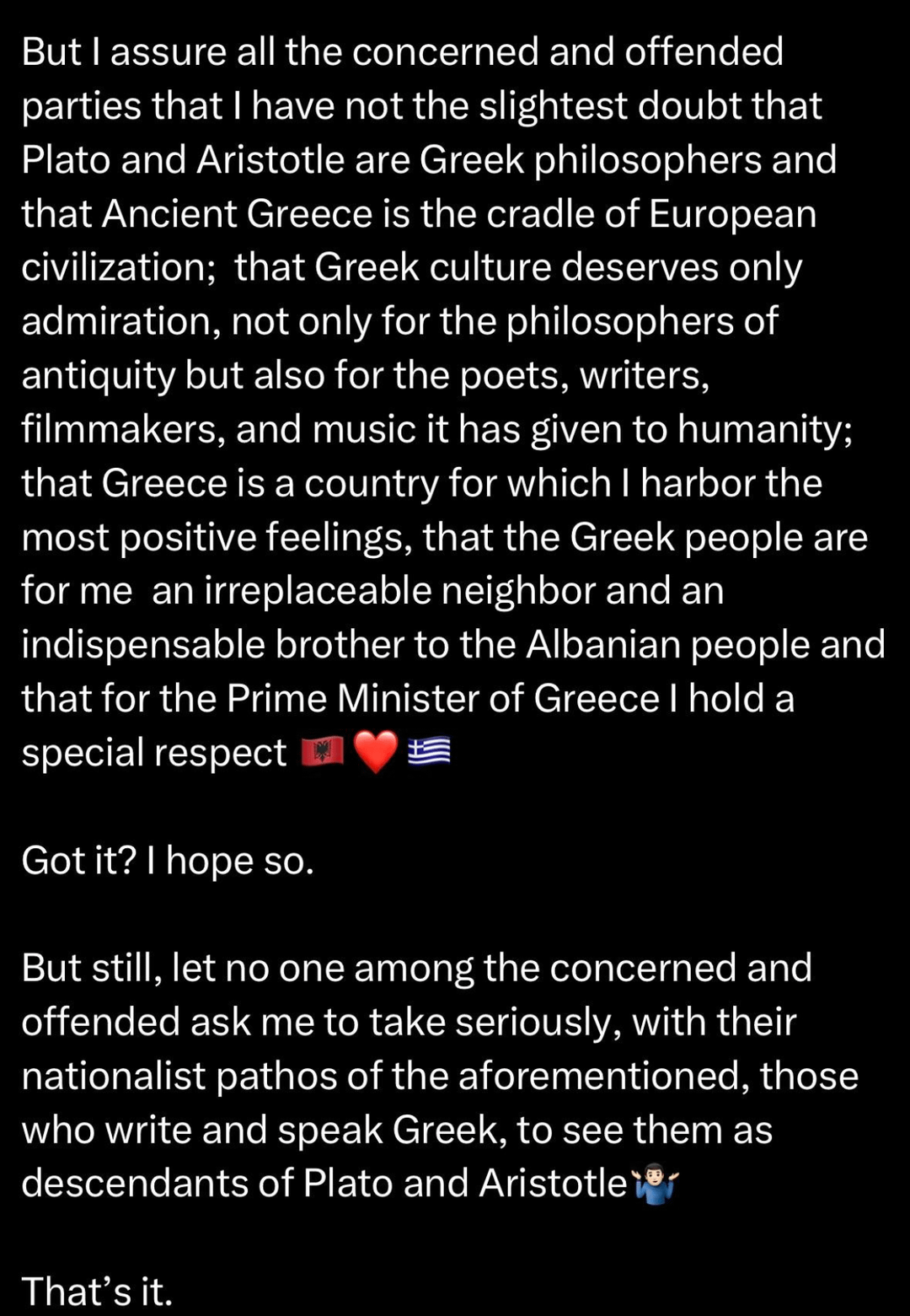 Το ακόμα πιο προκλητικό είναι ότι στο τέλος ουσιαστικά υπονοεί πως τα εννοούσε πλήρως, φτάνοντας στο σημείο να αμφισβητεί ότι ο Αριστοτέλης και ο Πλάτωνας ήταν Έλληνες και να παρουσιάζει τους σύγχρονους Έλληνες ως απλούς χρήστες της ελληνικής γλώσσας. Αυτό είναι κλασική εθνικιστική ρητορική, όχι χιούμορ.
