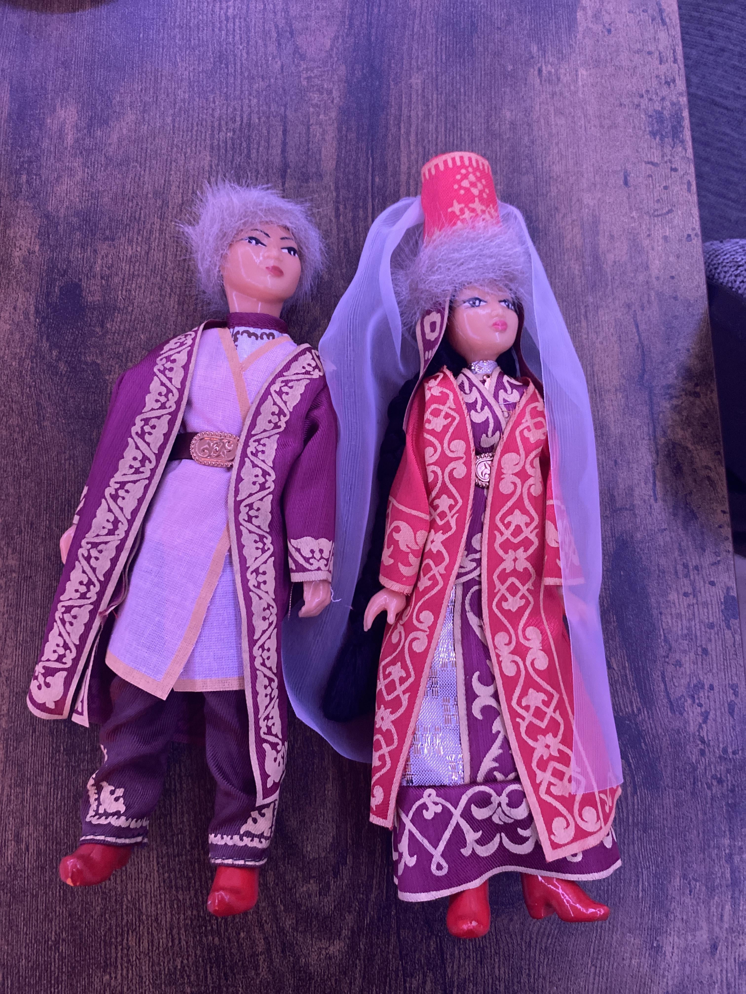 Ich habe diese in einem Gebrauchtwarenladen gekauft. Ich habe versucht, sie online nachzuschlagen, und einige Quellen sagten, es handele sich um sowjetisch-aserbaidschanische Puppen, andere sagten, es handele sich um sowjetische kasachische Puppen. Scheint die Kleidung oder der Stil der traditionellen aserbaidschanischen Kleidung zu ähneln? Ich frage dies auch auf der Kasachstan-Seite, um es zu sehen.