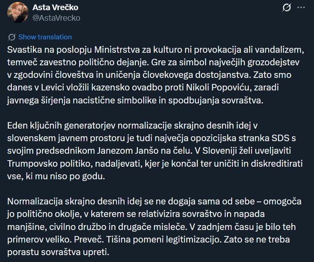 Kako so se odzvali leta 2021, ko se je zgodila [identična situacija](https://www.rtvslo.si/kultura/drugo/neznanci-s-kljukastimi-krizi-popisali-procelje-ministrstva-za-kulturo/583657)?