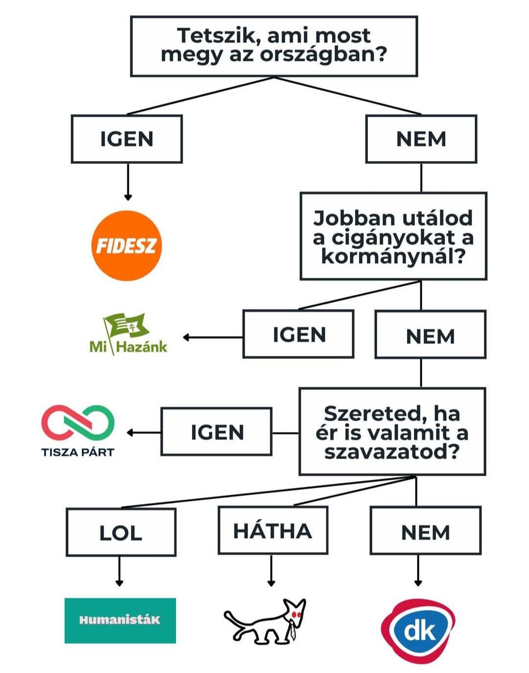 Szerintem az első döntési pont vezethet csak a mi hazánk / fidesz duóhoz, minden másnak protest rendszerváltó szavazatnak kell lennie. És az alsó 3 szarhoz sem szabadna, hogy ebben a helyzetben nyíl menjen.