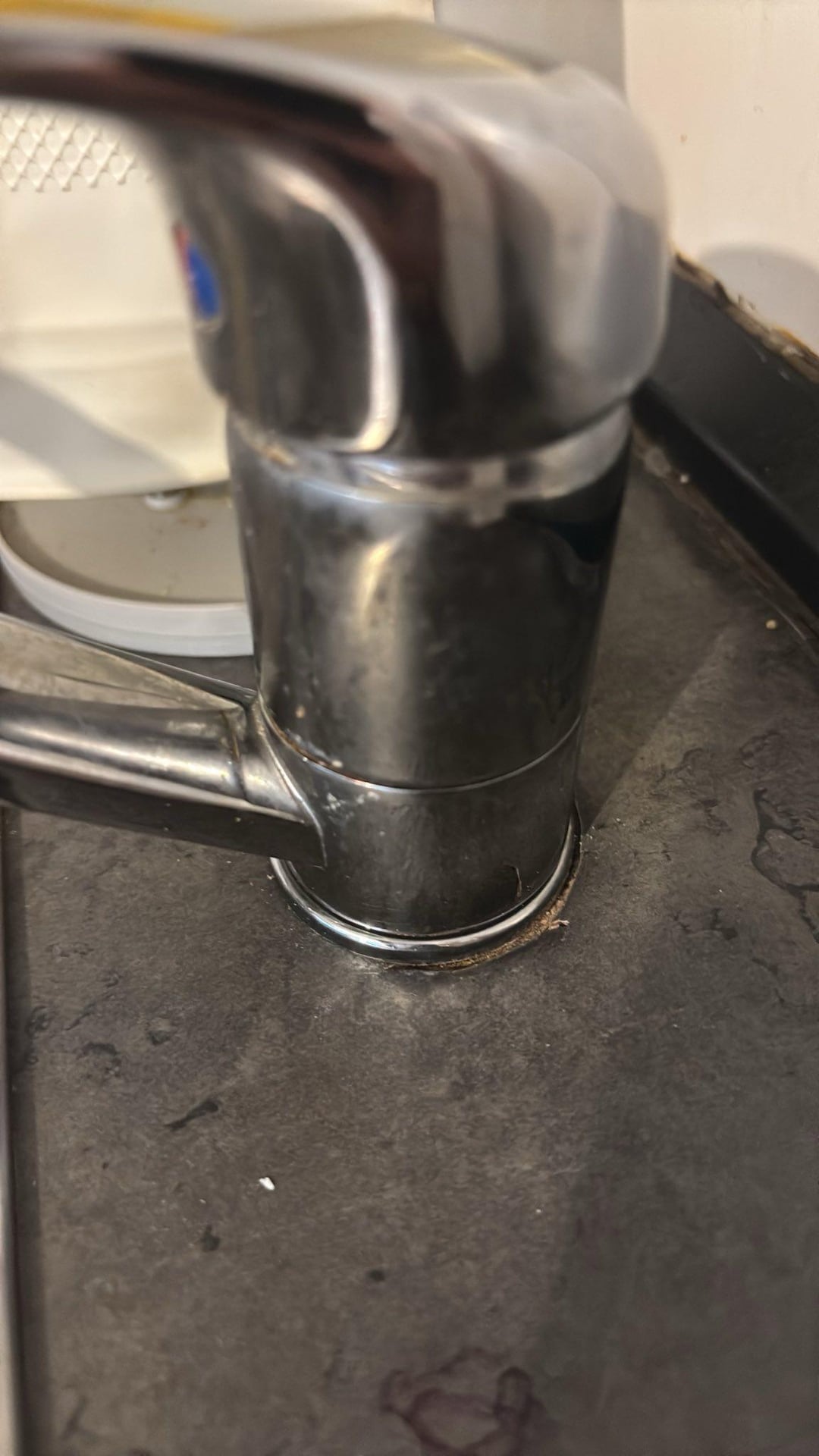 Mir ist gerade aufgefallen, dass der Wasserhahn in der Küche lose ist, und ich habe festgestellt, dass er von unten undicht ist und wie beschädigtes Holz aussieht (Küchenoberseite).