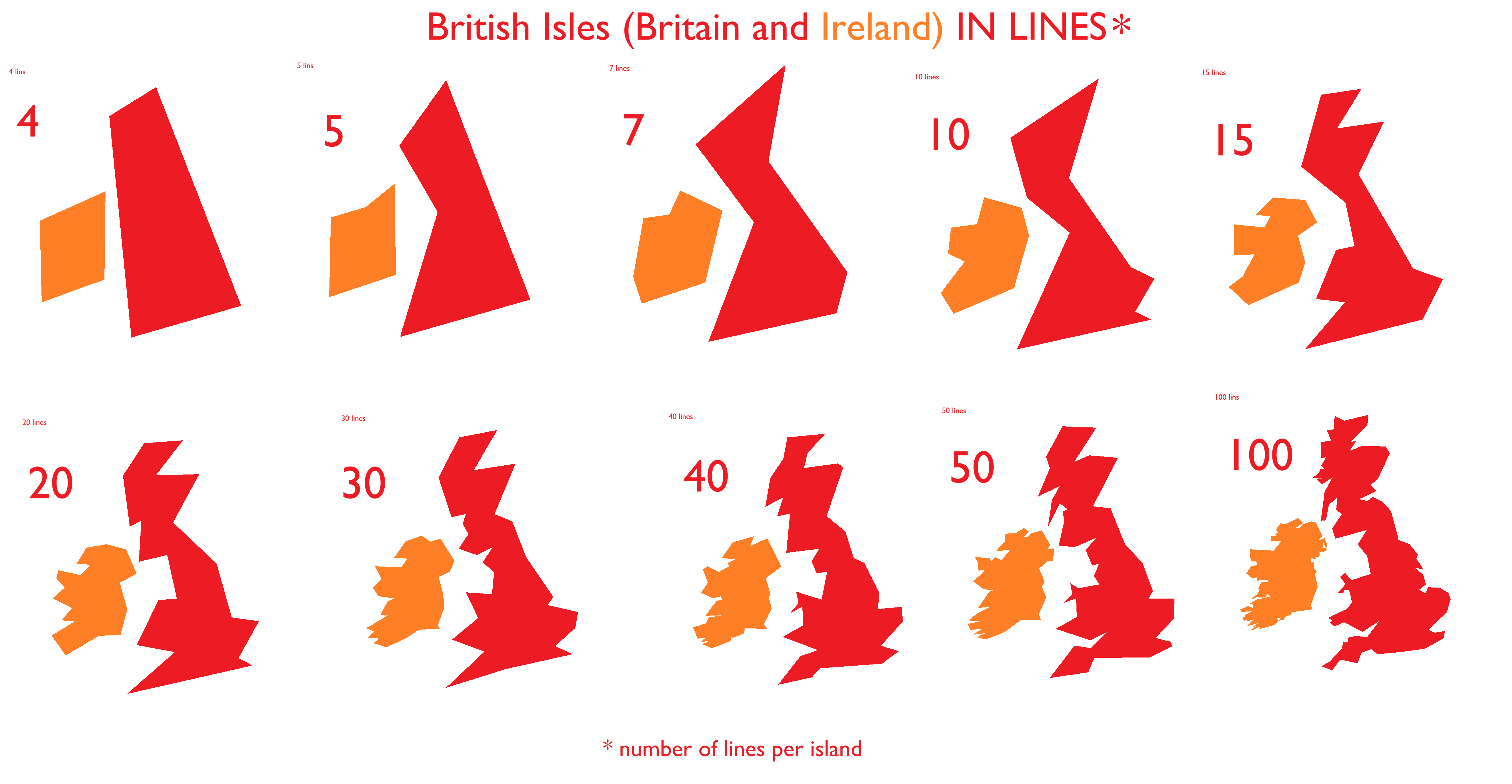 I can probably recognize ireland at around 10 and the Uk at 15 anything less and i would just call it squiggles