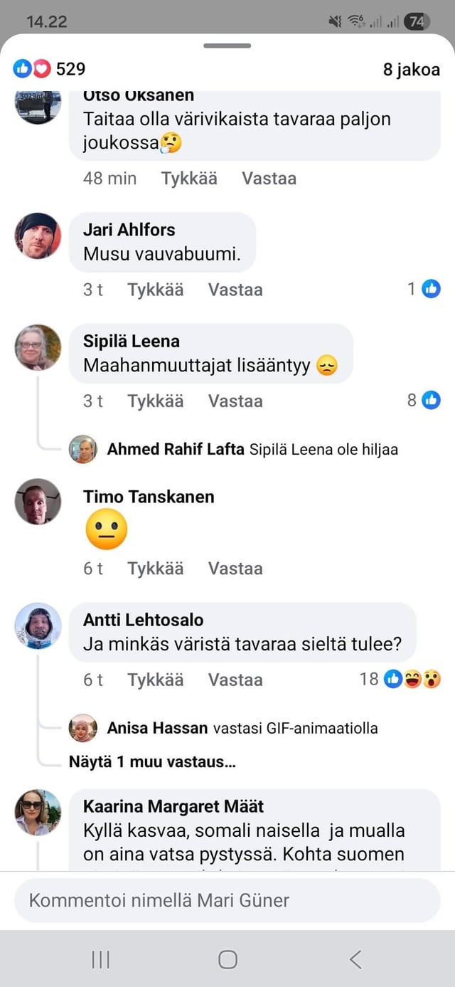 Ich bin mir nicht sicher, ob Finnland noch ein sicherer Ort für Familien ist. Was zum Teufel denken sie? Sie machen Einwanderer für ihre finanziellen Schwierigkeiten verantwortlich, aber ich denke, Einwanderer nehmen ihnen auch den Reichtum an Freundlichkeit weg.
