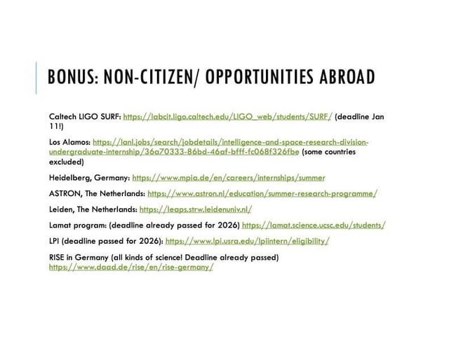 Caltech LIGO SURF: https://labcit.ligo.caltech.edu/LIGO\_web/students/SURF/ (Einsendeschluss Jan