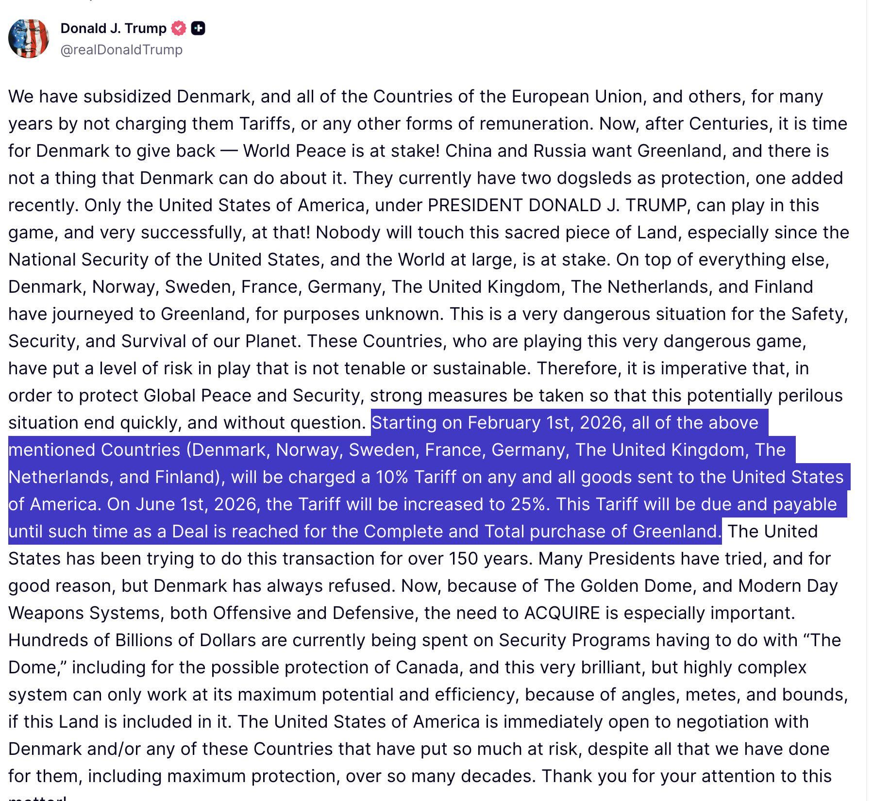 JUST IN – Trump kündigt ab dem 1. Februar einen Zollsatz von 10 % für Dänemark, Norwegen, Schweden, Frankreich, Deutschland, das Vereinigte Königreich, die Niederlande und Finnland an, der am 1. Juni auf 25 % angehoben wird, bis „eine Einigung über den vollständigen Kauf Grönlands erzielt wird“.