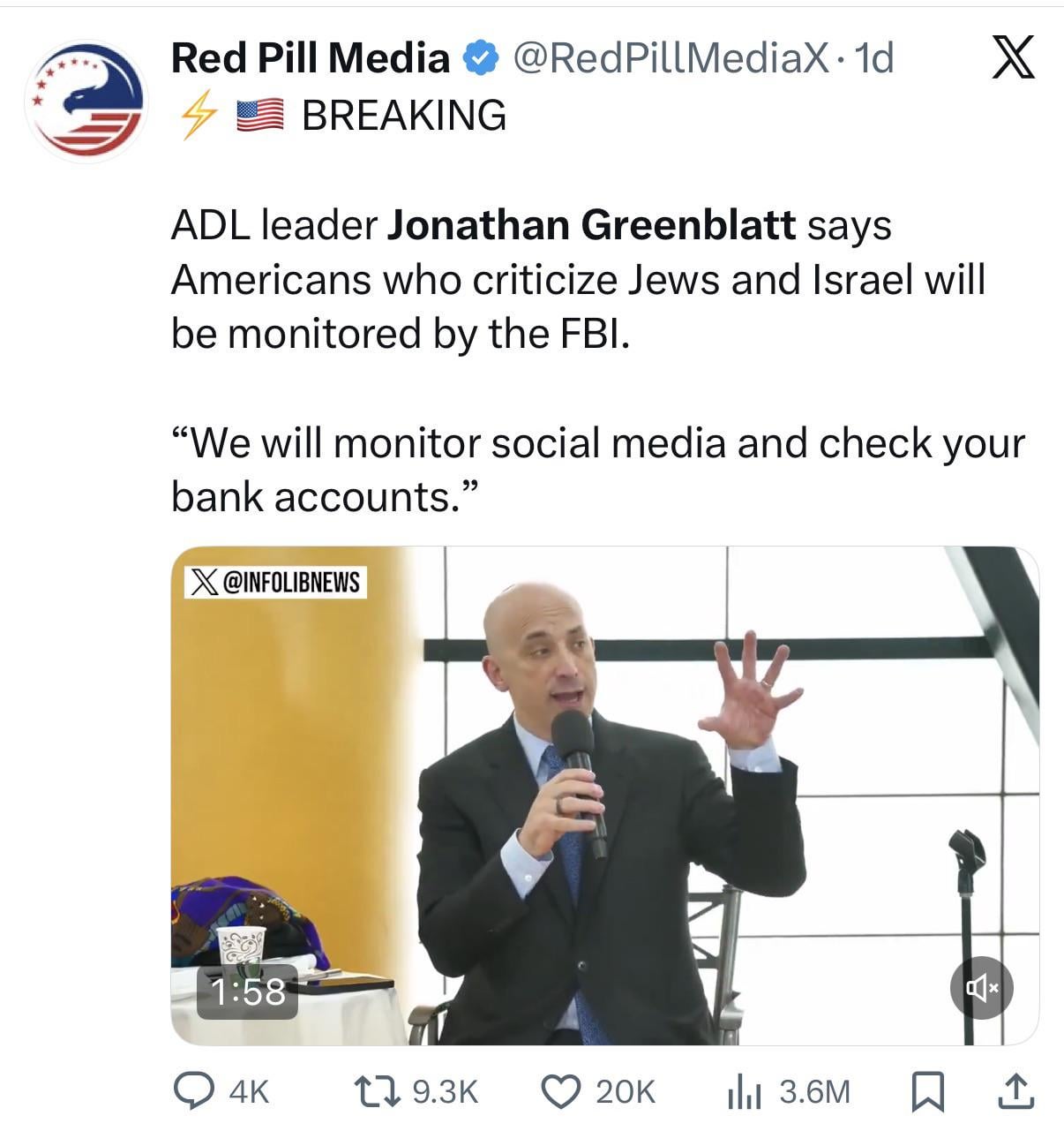 He said the ADL has its own extremely invasive private intelligence service which then reports innocent people to the FBI if the ADL thinks their target is anti-Semitic (which covers basically everyone in the world except for Bibi and Greenblatt, apparently).