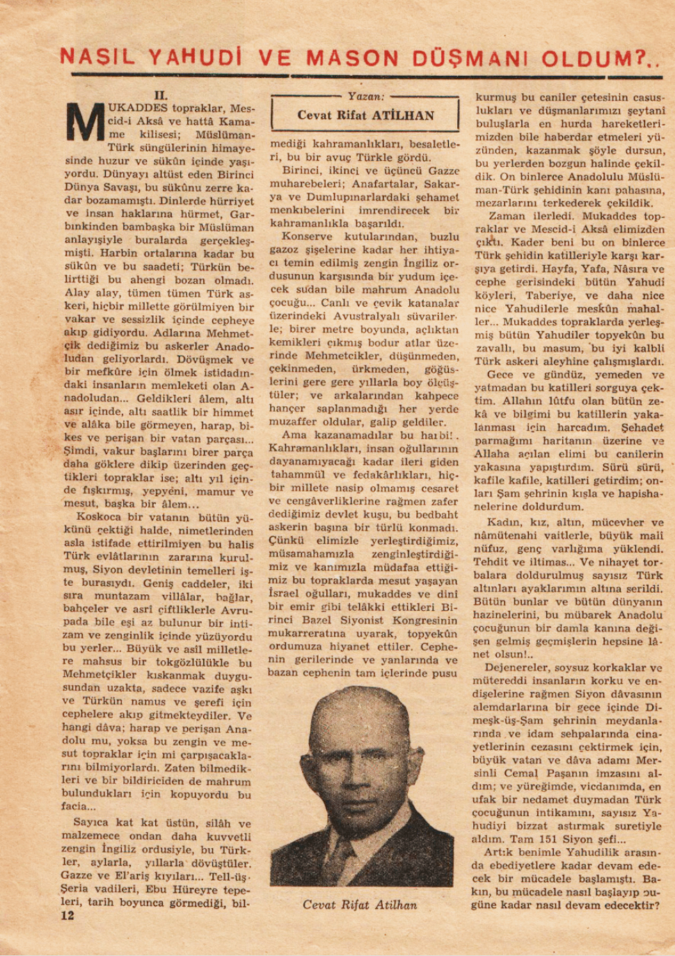 Kaynak: Cevat Rifat ATİLHAN, „Nasıl Yahudi ve Mason Düşmanı Oldum?.. II.“, Büyük Doğu, 25 Ağustos 1950, yıl: 6, sayı: 23, s. 12.