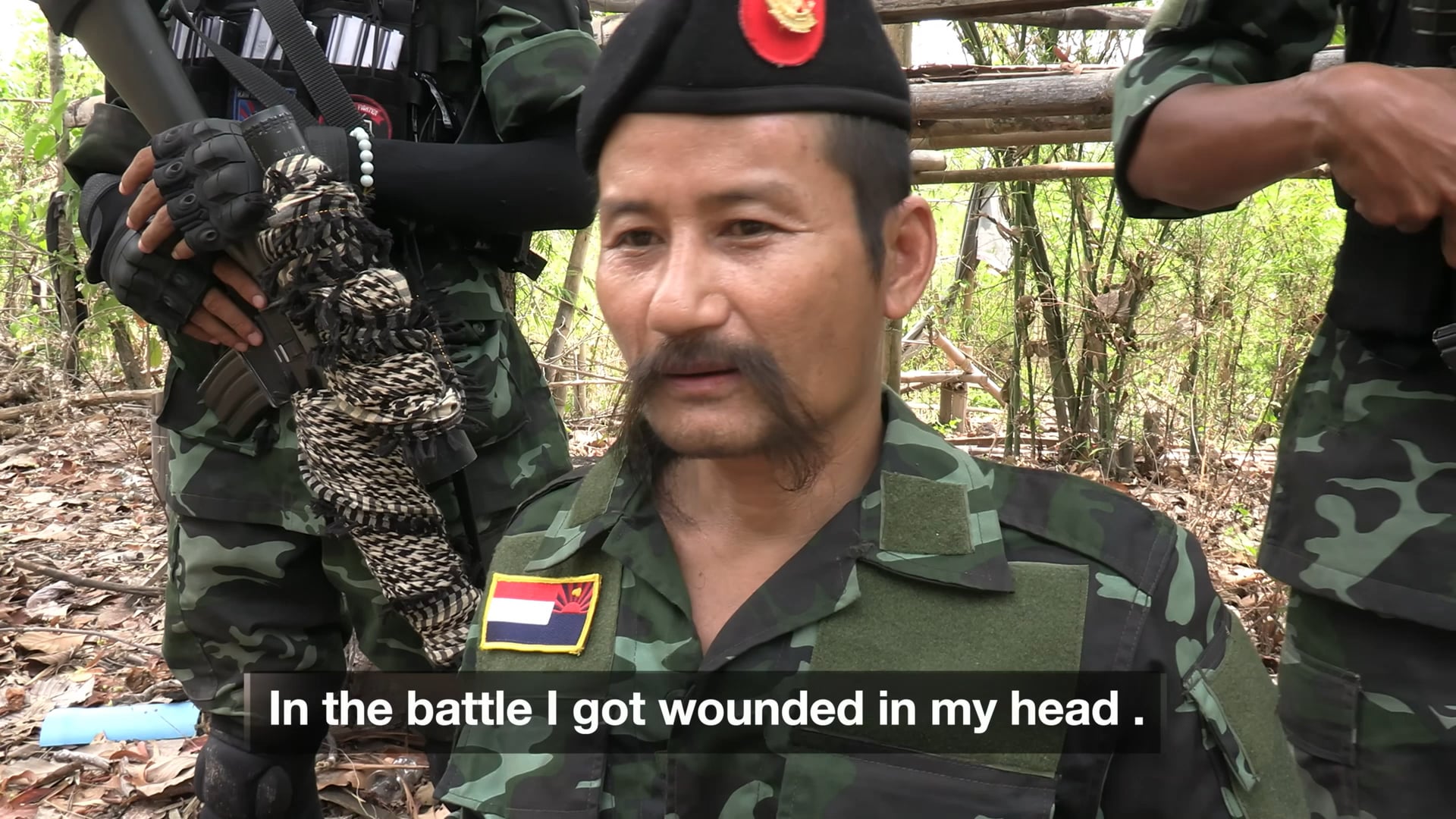 Aufnahmen einer Schlacht am 26.06.2022 gegen die Armee von Myanmar (Burma), bei der der KTLA-Truppenführer Thu Kho Sa Keh durch einen Kopfsplitter verwundet wurde (in einem Interview miteinander verflochten)