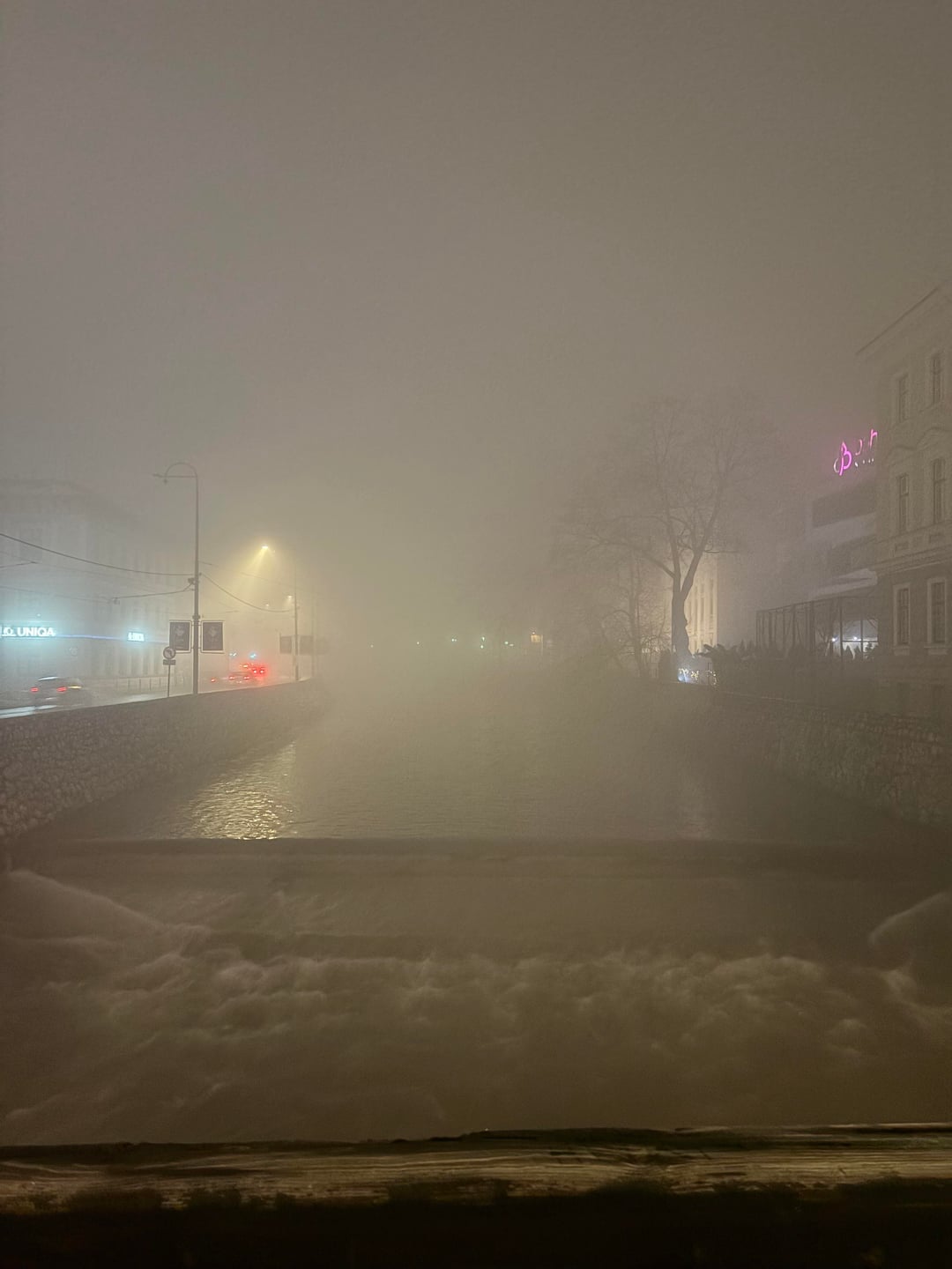 Samstag. Alles ist leer. Auf den Straßen von Sarajevo gibt es keine lebende Seele. Der Nebel hat sich gelegt und Sie können keinen Finger mehr vor Ihrem Auge sehen. Vor der Kamera sieht es viel besser aus als live.