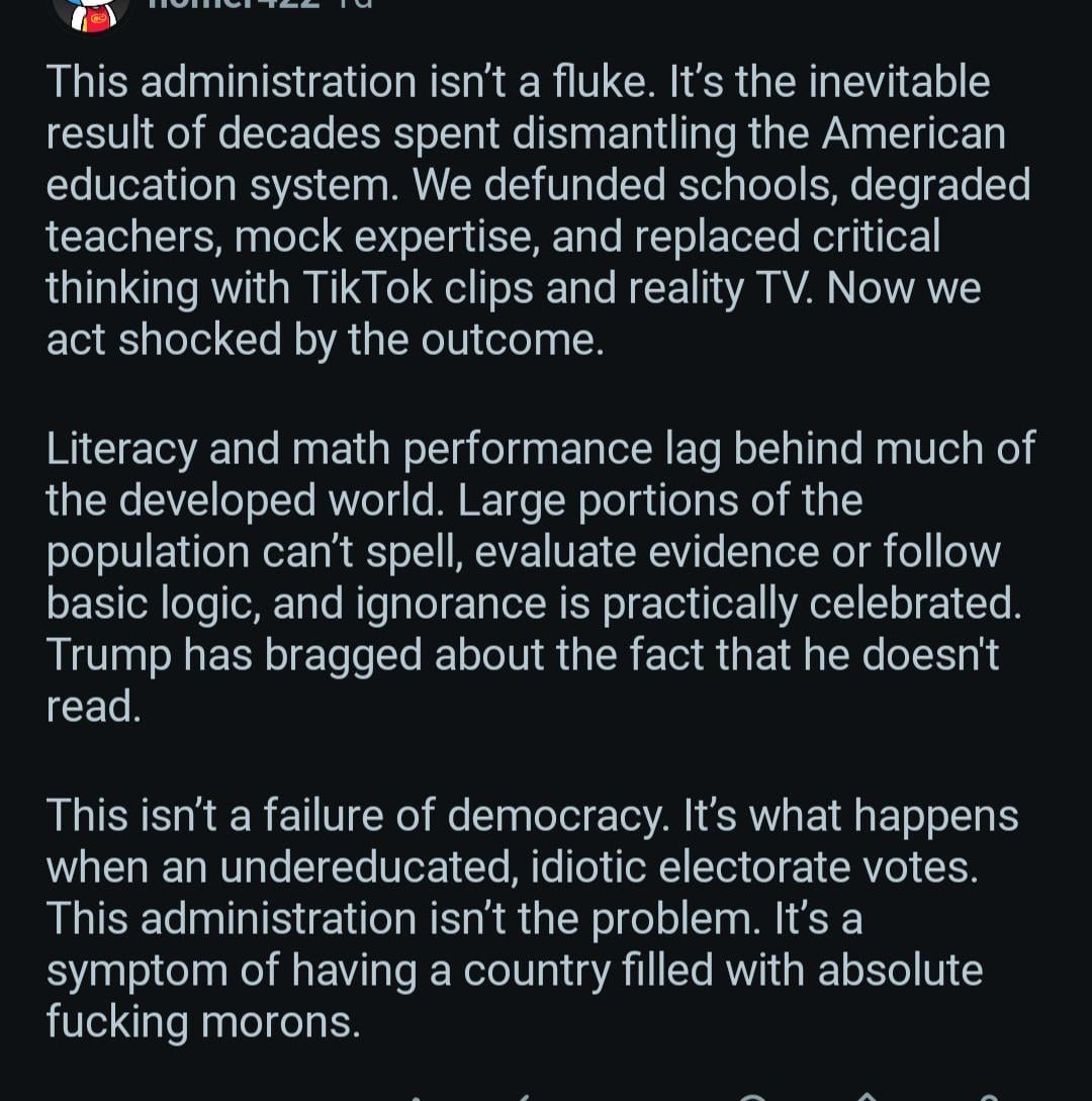 5. American Romo here. It was sad to realize that this is pretty true. Half the country voted him in.. twice. Even with all this Epstein confirmation stuff, I’m pretty convinced they’d vote him in a third time, and I’m scared that there will be a 3rd time.