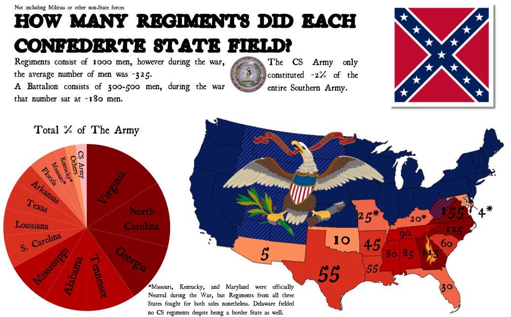 God damn I’m from NC and I didn’t realize we were second most. Did we have a decently larger population than some of the others? I know the western part of the state was less eager to join the war and ultimately we were second to last to join, what led to such a high number? Why so small from SC, too? Weren’t they real eager to get the war going?