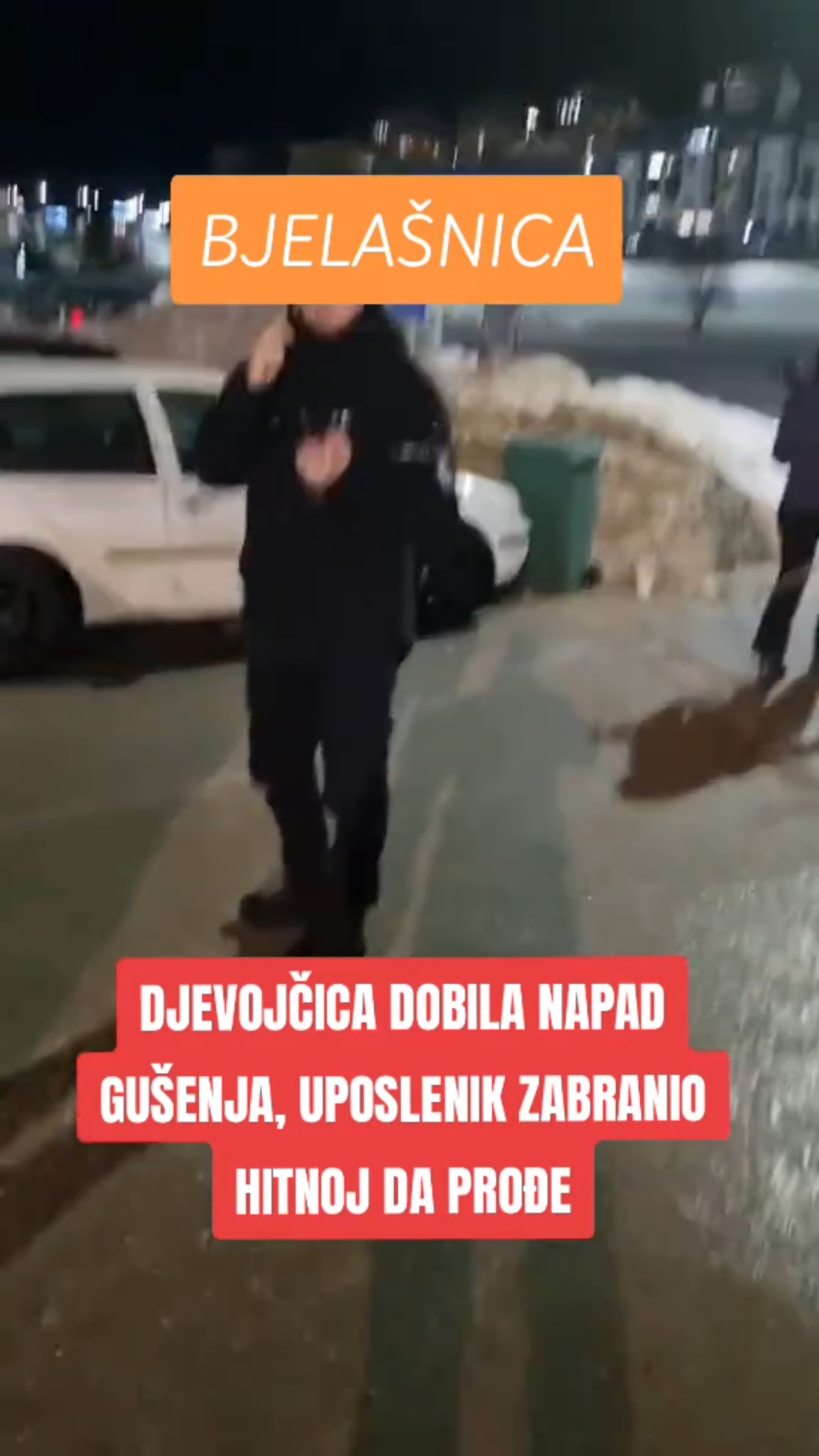 **Po izlasku iz ambulante oko 20:30 sati, na parkingu nas je zaustavio radnik ZOI-a, koji je zabranio izlazak vozilu hitne pomoći prije 21:00 sat**, uz obrazloženje da se niko ne smije odjaviti niti predati ključeve i motorolu prije tog vremena. Uprkos ponovljenim objašnjenjima da se radi o životno ugroženom djetetu, te uprkos jasnom nalogu doktorice da je hitan transport neophodan, **radnik je, nakon telefonskog razgovora sa svojim nadređenim, odbio da omogući prolaz vozilu hitne pomoći**.