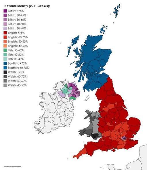 This is outdated: at the [2021–2022 censuses](https://www.reddit.com/r/MapPorn/comments/1cycv99/national_identity_in_the_uk_from_the_202122/), the primary identity in England was ‚British‘. The [Office for National Statistics](https://www.ons.gov.uk/peoplepopulationandcommunity/culturalidentity/ethnicity/bulletins/nationalidentityenglandandwales/census2021) attributed this to ‚British‘ appearing before ‚English‘ on the relevant question on the census form.