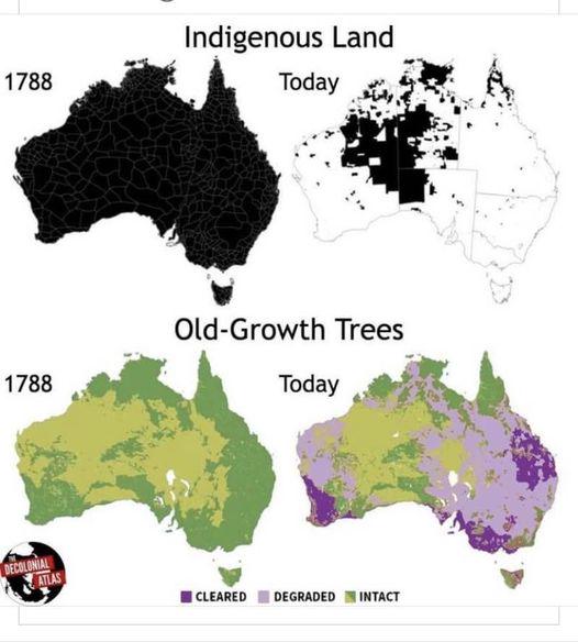 So obviously this is a silly and incorrect map, what does „degraded“ even mean and why is the majority of the Gondwana Rainforests considered cleared? It’s one of the largest old growth forests in the world. Also indigenous land section is disingenuously framed, indigenous Australians lived in very concentrated clusters and were likely under 1 million in population throughout the whole of Australia. If you did a map in 1850 it’d look closer to 1788 because there were way less people living in concentrated clusters despite being a settler colony.