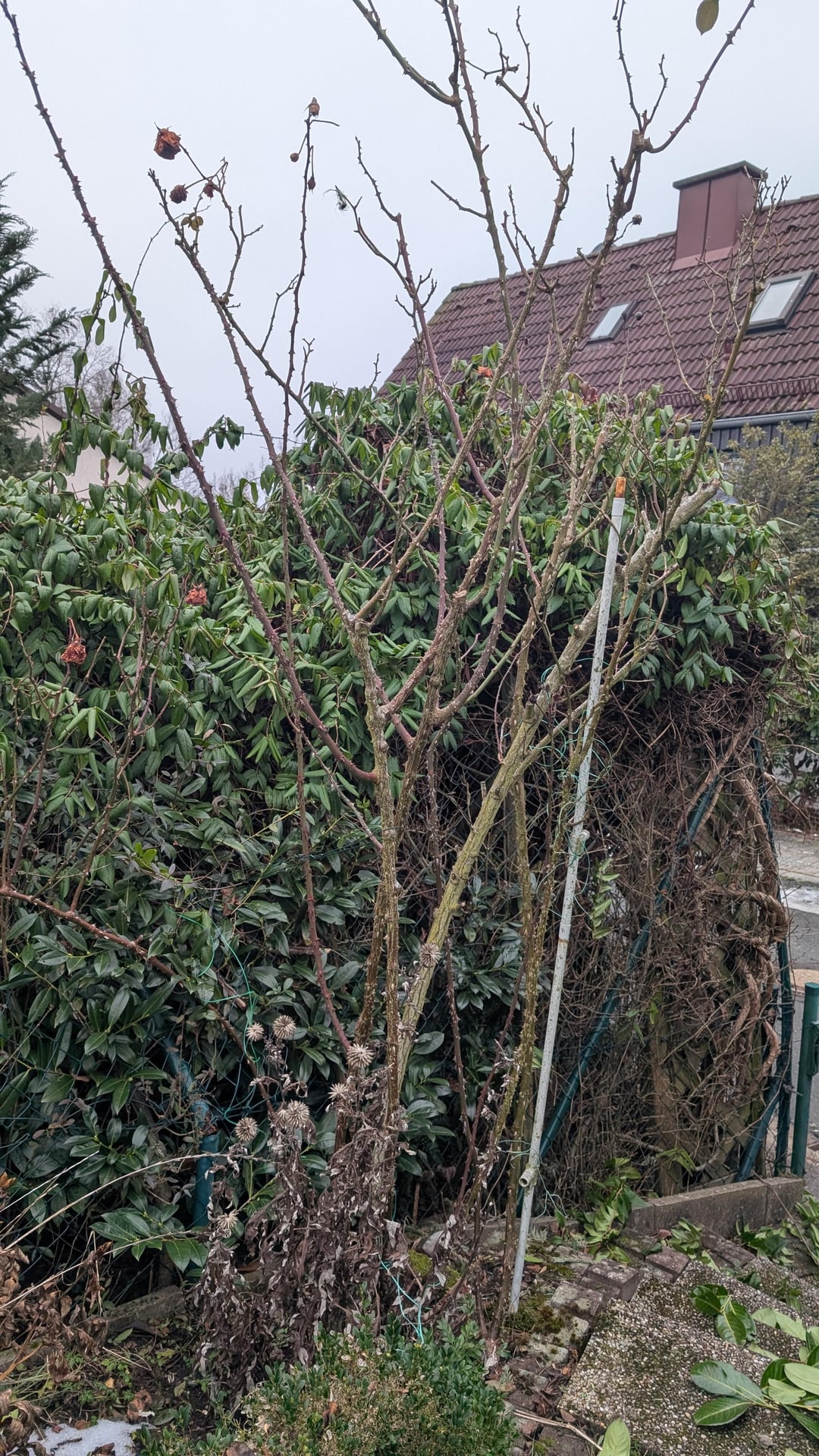Wir haben ein Haus übernommen und der Garten wurde kaum gepflegt. Für dem kleinen Tor blockieren zwei Rosenstöcke den Durchgang. Ich habe die inzwischen mit Draht zurück gebunden.