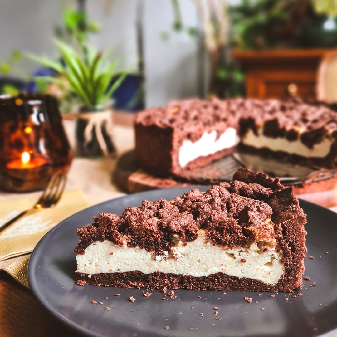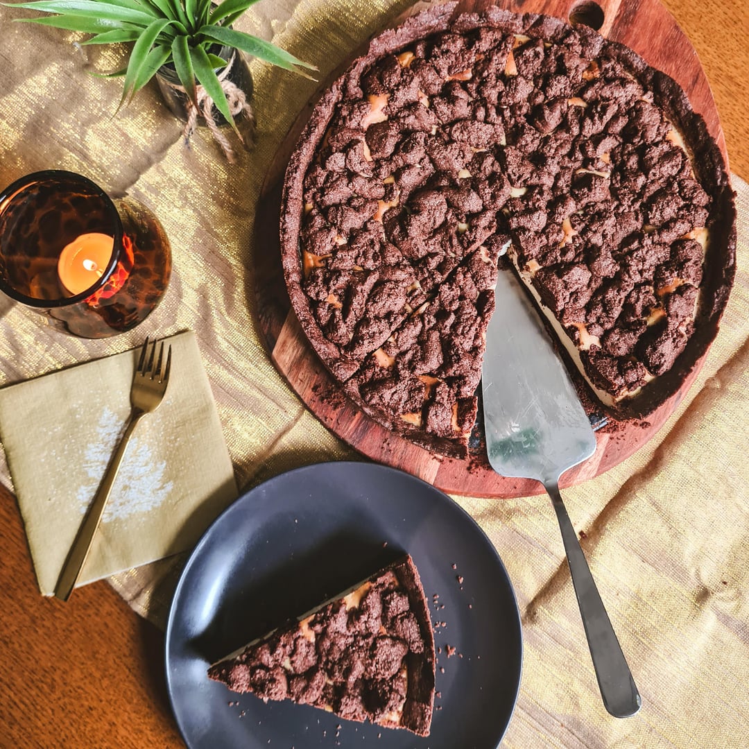 Springform fetten. 2/3 vom Teig dünn ausrollen, auf dem Boden und Rand der Form verteilen. Rand recht hochziehen, damit die Füllung nicht überläuft, da er beim Backen etwas aufgeht. Füllung drauf geben. Restlichen Teig als Streusel darauf verteilen.