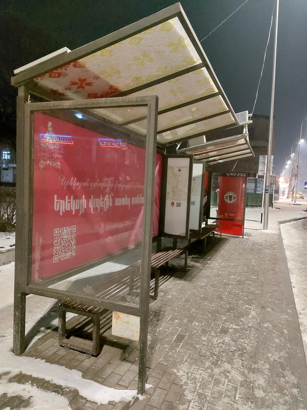 - Gjumri – lange Bushaltestellen (zwei Wartehäuschen nebeneinander) an stark frequentierten Haltestellen. Eriwan hat viel mehr Menschen an den Haltestellen, dennoch sind die Notunterkünfte alle sehr klein