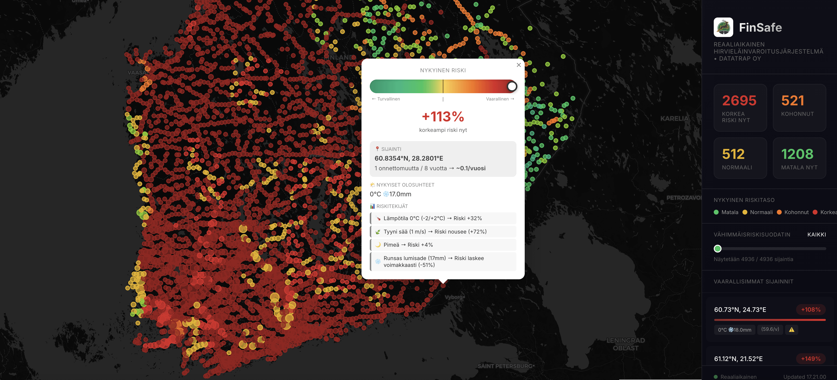 Wir haben 103.386 verifizierte Wildtierkollisionen in Finnland analysiert und sie mit Live-Wetter, Tageslichtsimulation und saisonalen Mustern kombiniert.