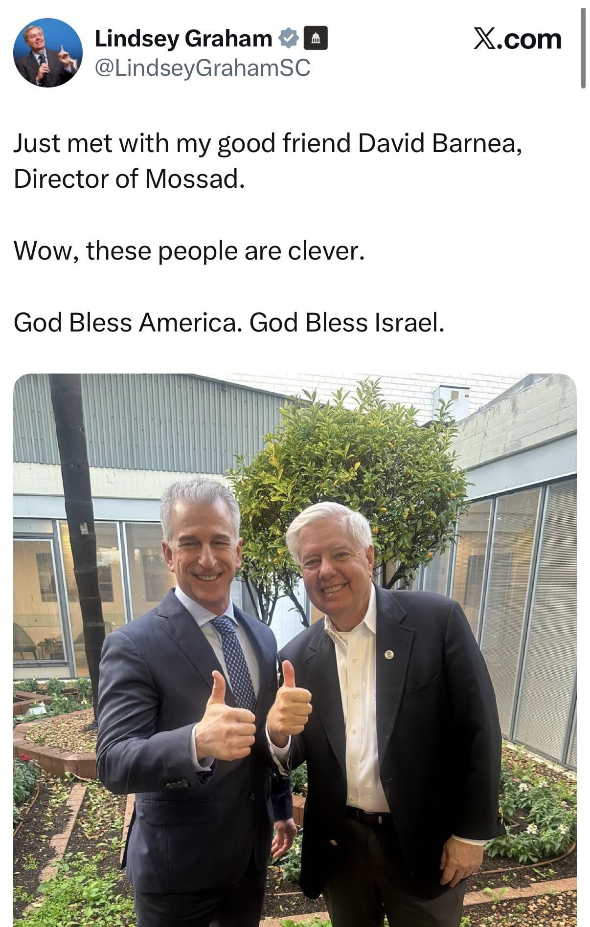 Lindsey says: *“Just met with my good friend, David Barnea, Director of Mossad.*