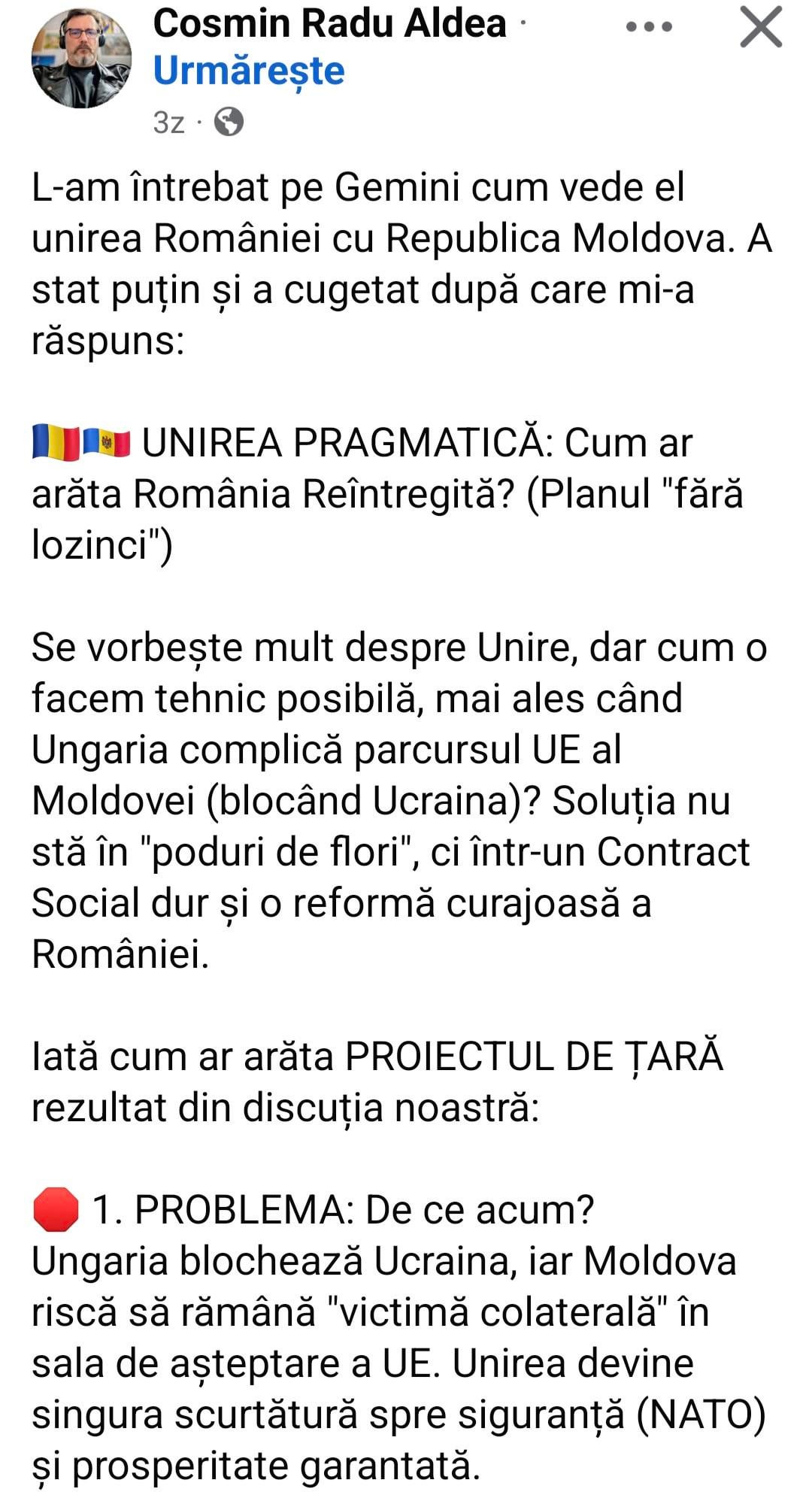 Ca si Roman mare sustinator de unire cu R Moldova, daca ma pui sa aleg intre stat unitar si unire, o sa aleg intodeauna statul unitar.