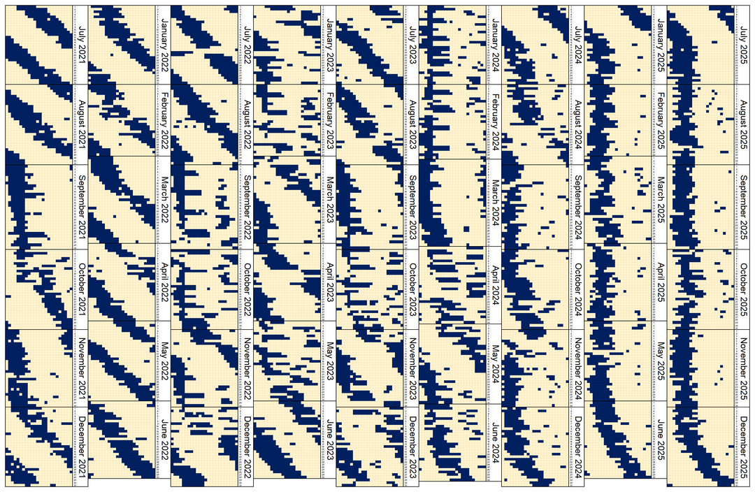 Die Grafik zeigt meinen Schlaf "Zeitplan" von Juli 2021 bis Dezember 2025. Jede Spalte ist in 6 Monate unterteilt, jeder Monat ist in ca. 30 Tage (Zeilen) unterteilt und jeder Tag ist weiter in 24 Stunden (Zellen) unterteilt. Eine Zelle stellt eine Wach-/Schlafstunde dar, beige gefärbt für wach oder dunkelblau für schlafend. Das heißt, ich habe insgesamt gezählt 39.480 Stunden seit ich angefangen habe. Für einen gesunden Menschen würde die Version dieses Diagramms perfekt vertikale Balken anstelle diagonaler Linien aufweisen.