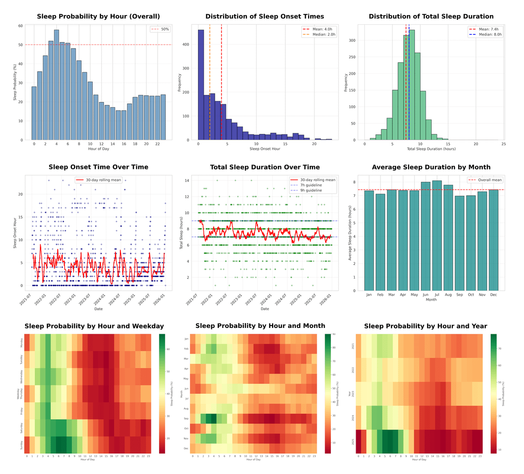 Was die Statistiken angeht, sind die Trends überraschend regelmäßig, wenn man die Abweichung in meinem Schlafbeginn (oder meiner Schlafenszeit) außer Acht lässt. Ich habe jeden Tag durchschnittlich 7-8 Stunden geschlafen. Im Jahr 2025 hatte ich auch den beständigsten Schlafplan mit der geringsten Abweichung beim Einschlafen (±3,29 Stunden, im Vergleich zu anderen Jahren, die bei etwa ±5 Stunden lagen). Die wichtigsten Erkenntnisse aus der Analyse sind, dass mein Zeitpunkt des Einschlafens eine hohe Variabilität aufweist und meine Schlafdauer eine moderate Variabilität aufweist.