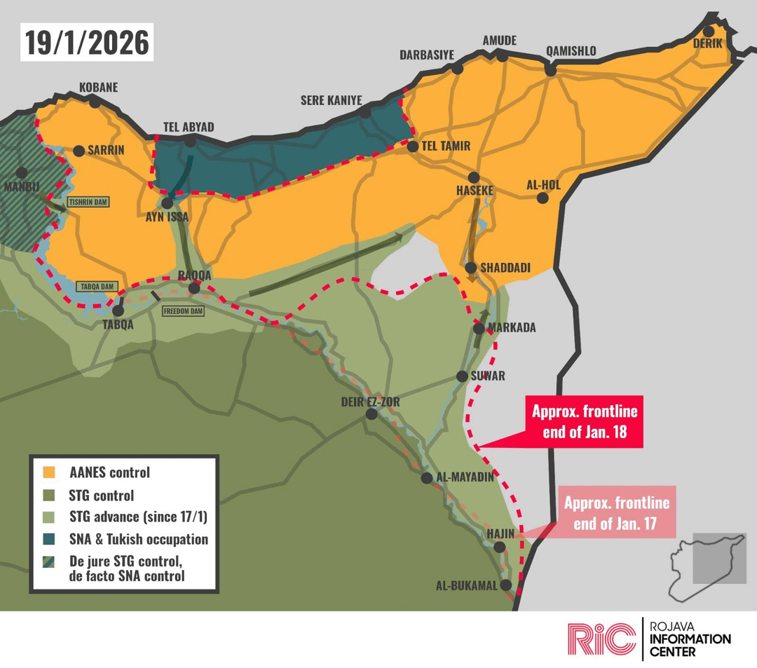 Tie isté USA, ktoré roky chránili Kurdov pred Daeshom a dovolili DASSVS vytvoriť model rovnocenného spolunažívania Arabov, Kurdov, Asýrčanov či Jezídov – s rovnými právami žien, ekológiou a priamou demokraciou na lokálnej úrovni – dnes jednostranne zradili svojich spojencov! Tom Barrack, Trumpov vyslanec, donútil SDF kapitulovať cez 14-bodovú dohodu z 18. januára: odovzdanie Raqqy, Deir ez-Zoru, ropných polí, hraníc a táborov s islamistami Damasku pod kontrolu sýrskej vlády Ahmeda al-Sharaa. SDF veliteľ Mazloum Abdi musel ustúpiť, stiahnuť sa z oblastí ako Deir Hafer a Tishrin, lebo Turecko a USA tlačili na „integráciu“ do sýrskej armády. To nie je integrácia, to je likvidácia! Stovky Kurdských rodín utekajú pred tureckými proxy milíciami, ktoré už v Afrine a Serekaniyeh vraždili civilistov a znásilňovali ženy – a dnes sa vracajú ako víťazi!